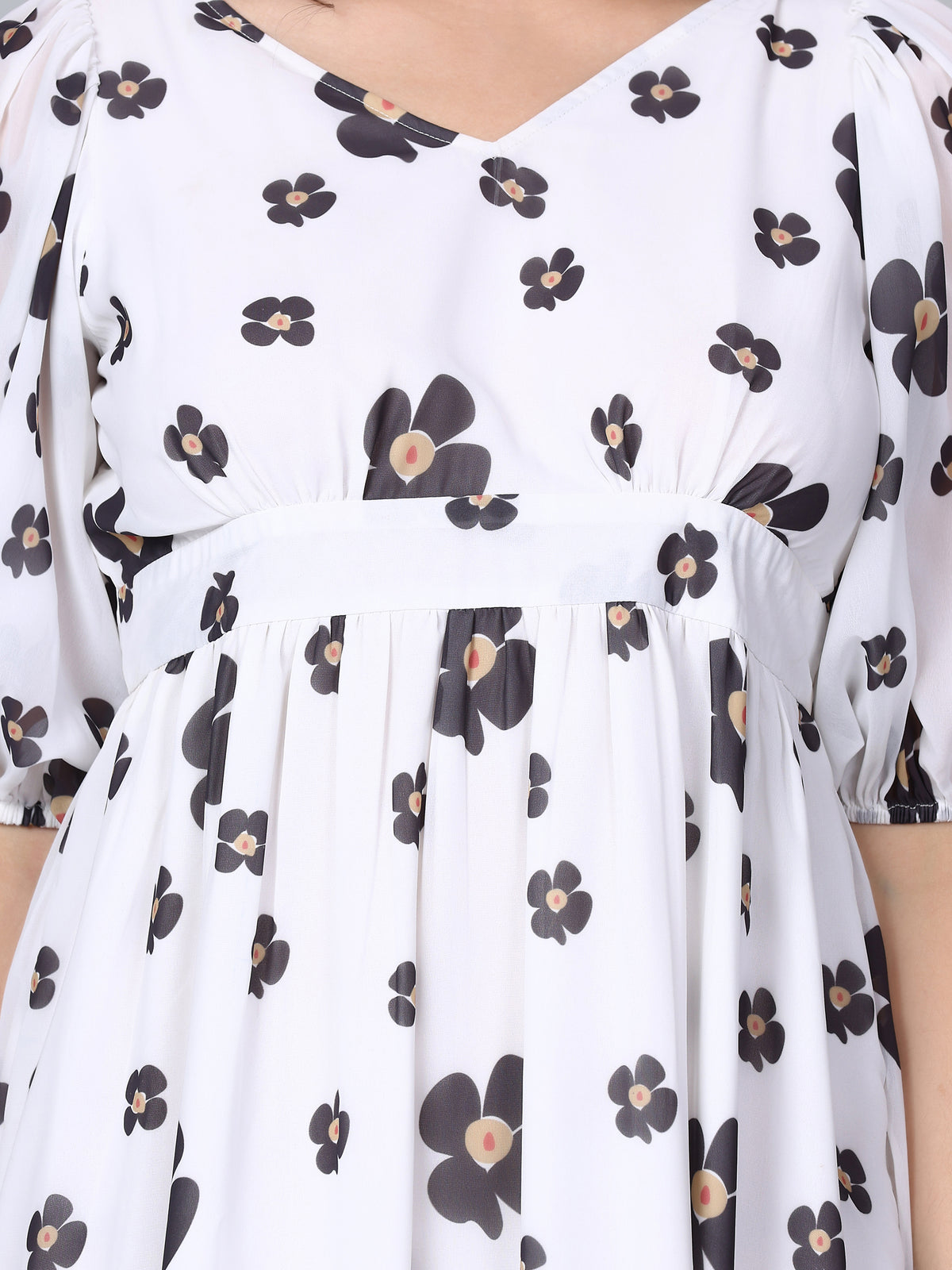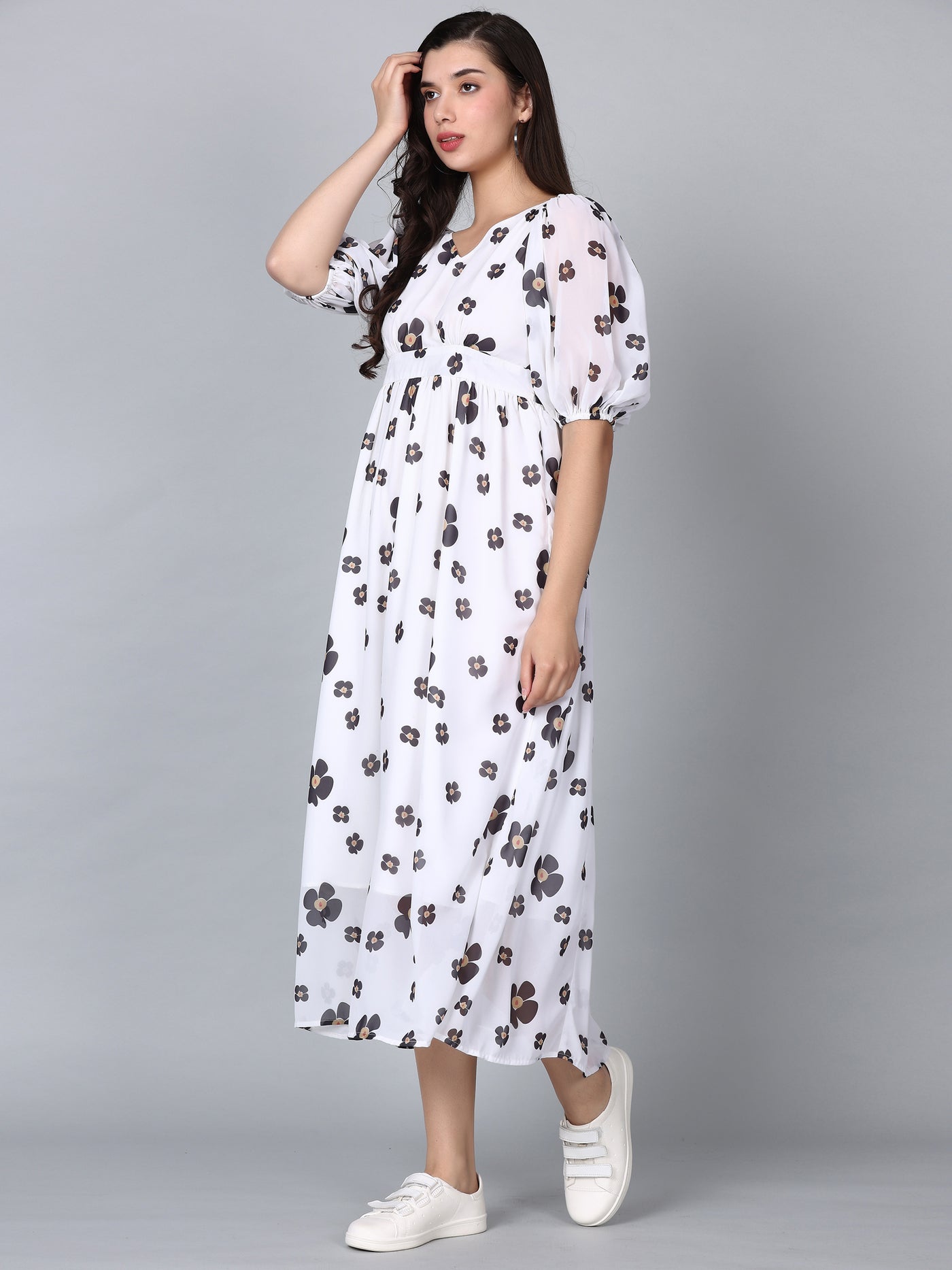 CK White Floral Print Puff Sleeves Long Dress